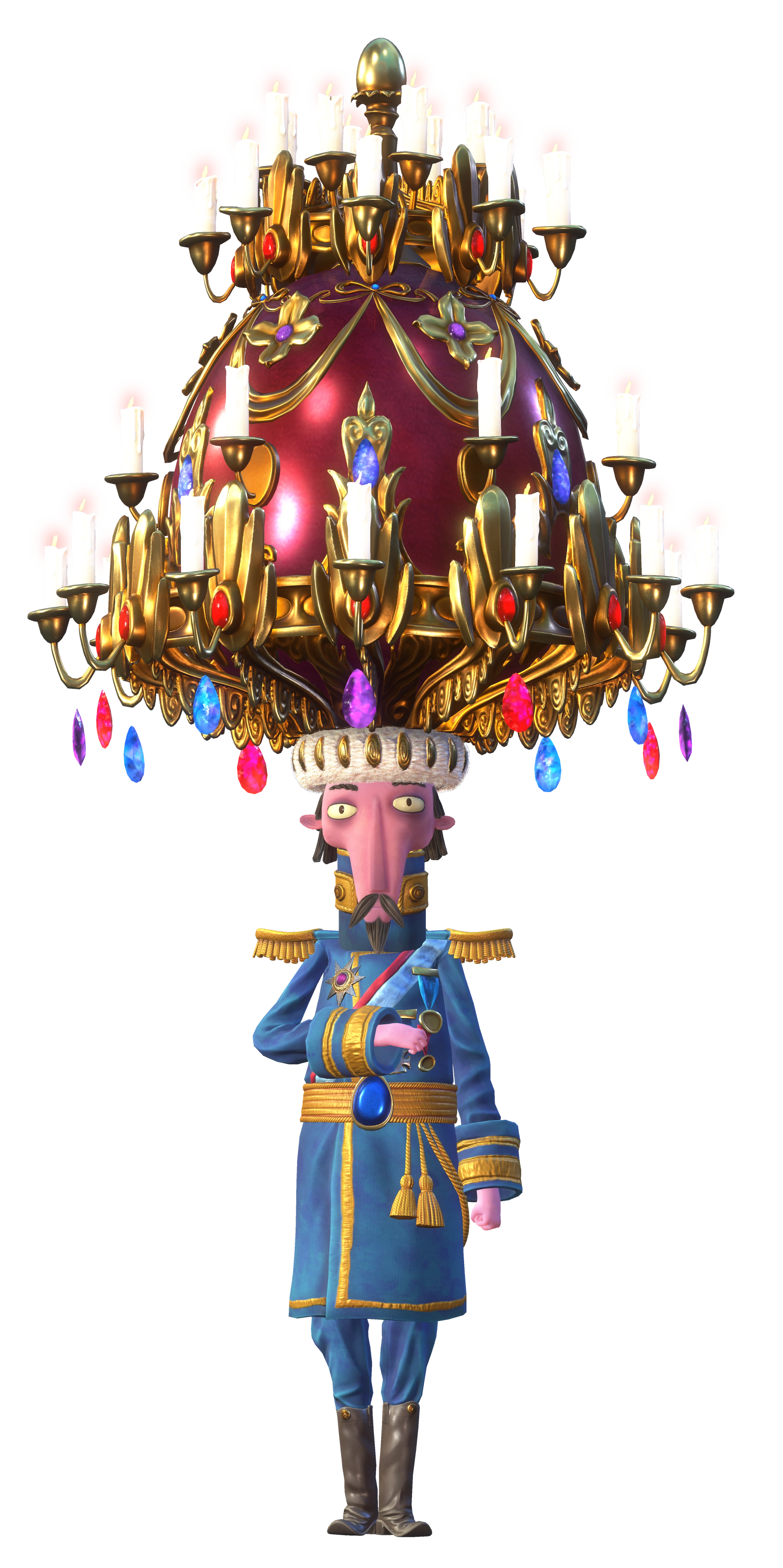 Gzar Theodore appears as a tall, imposing man with a well-groomed mustache and goatee, dressed in a blue and gold uniform with gold epaulettes, a white and red sash, and several medals pinned to the breast. His most prominent feature is his gargantuan crown, a jewel-studded golden sphere nearly as tall as he is and three times as wide. Many colorful jewels and lit candles hang from his crown, giving it the appearance of an enormous, gaudy chandelier.