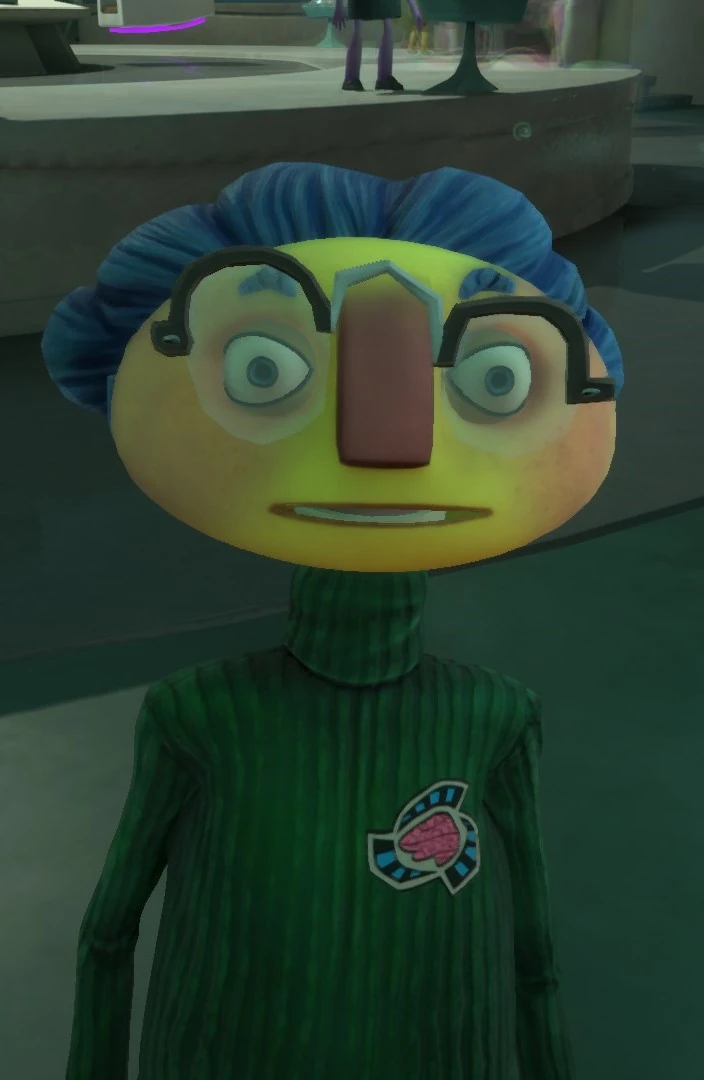 Hawkins mentions that he isn't showing his real face. However, his appearance in-game has blue hair, a red nose, yellow skin, and blue eyes. He wears the standard psychonaut uniform and large glasses.