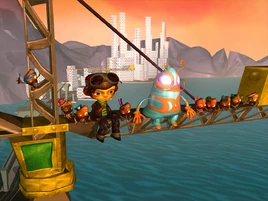 - Lungfishopolis Upper City: After passing the dam, Raz can reach the upper side of the city where the lakes become oceans, the buildings are much bigger, aside from tanks and trucks; vessels joins to the forces against Goggalor and features two routes to the skyscraper island. One having an under-construction bridge and the other a rapid transit transport with a long railway.
