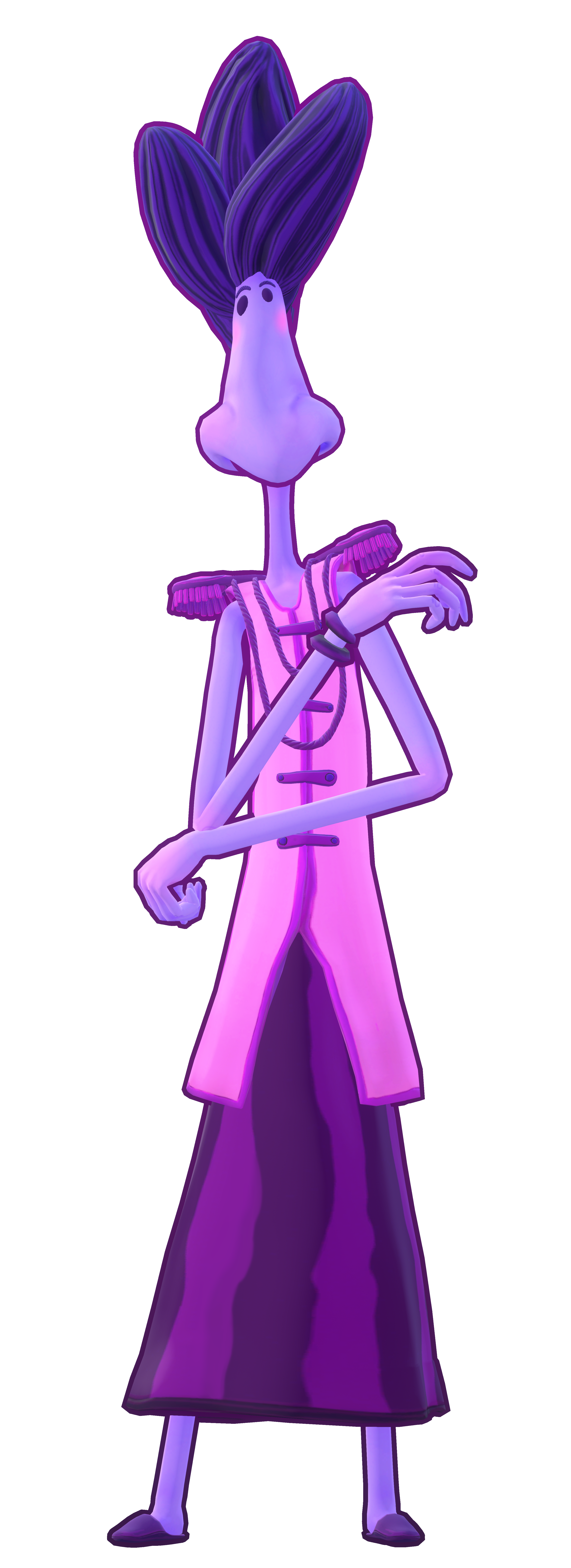 Sniffles wears light purple coat over a blue sweater and dark purple pants over purple shoes. She has a large nose for a head. Her hair resembles a fish tail.